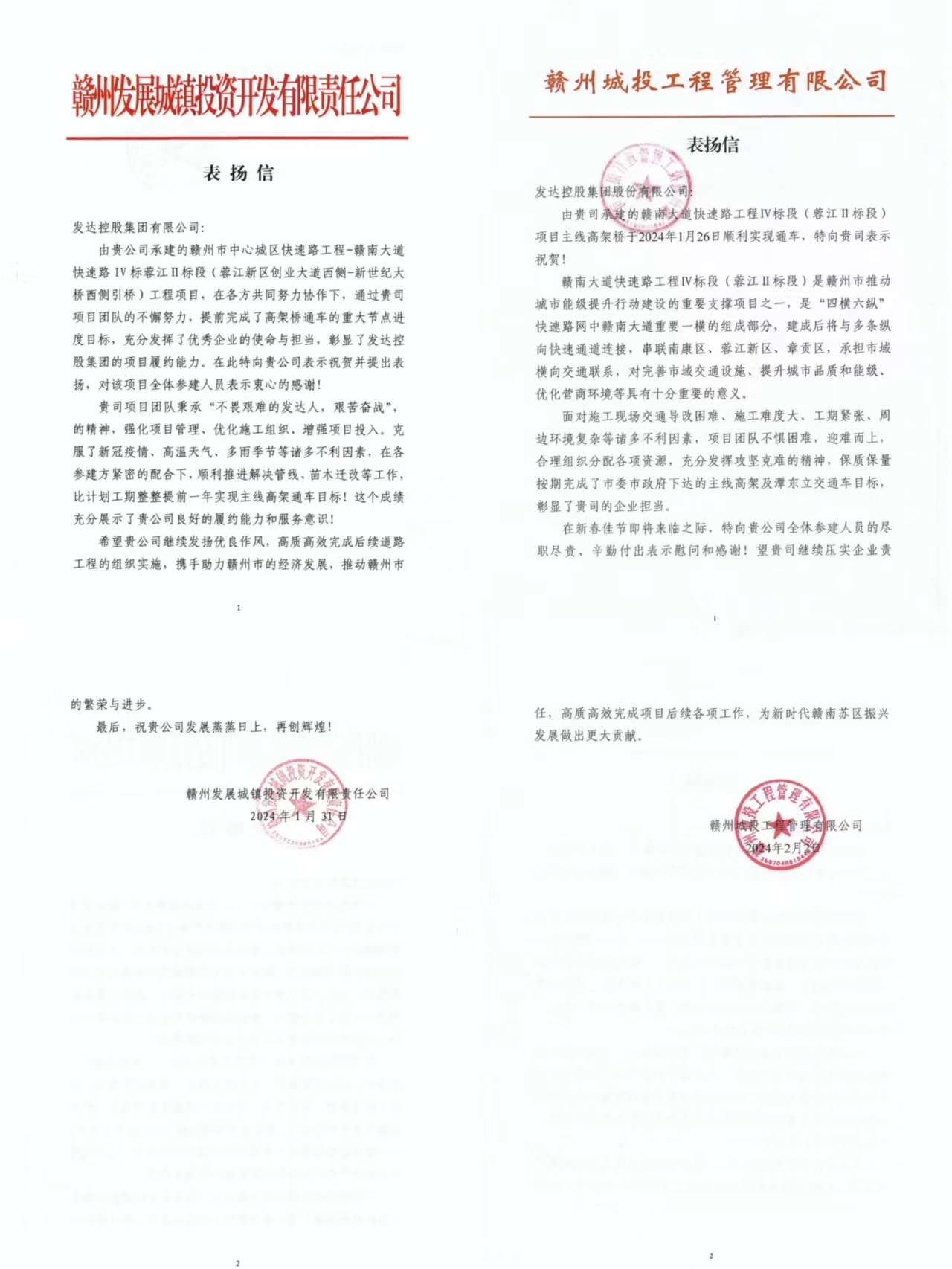春風(fēng)送喜,信任滿載。近日,贛南大道快速路IV標(biāo)蓉江II標(biāo)段項(xiàng)目收到業(yè)主單位贛州發(fā)展城鎮(zhèn)投資開(kāi)發(fā)有限責(zé)任公司,及代建單位贛州城投工程管理有限公司發(fā)來(lái)的表?yè)P(yáng)信,對(duì)項(xiàng)目提前實(shí)現(xiàn)主線高架通車(chē)表示祝賀,對(duì)項(xiàng)目全體參建人員履職盡責(zé),辛勤付出表示感謝。